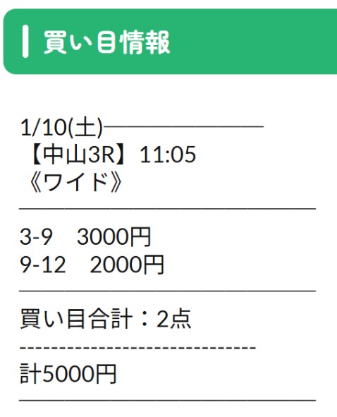 1月10日(土)の無料予想でえぶりが魅せた中山最終レースの買い目点数1点勝負