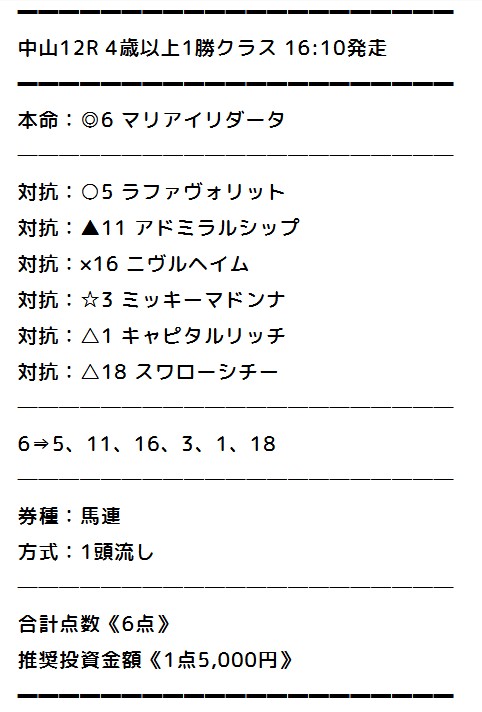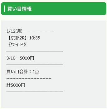 12日(月)は3日間開催最終日の中央無料予想で買い目点数1点で2万9000円獲得!